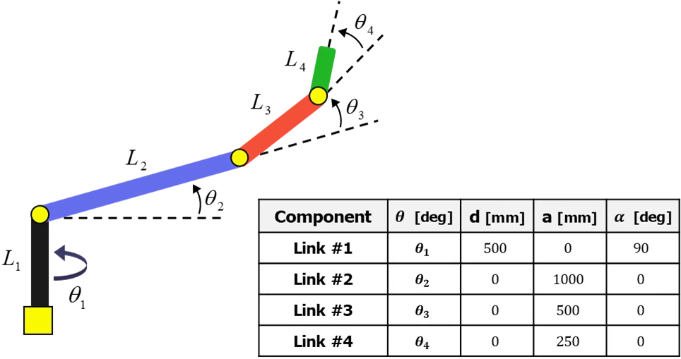linkLine{4}.geo = line([sum(L(2:3)), sum(L(2:4))], [0, 0], [L(1), L(1)], 'LineWidth', 5, 'Color', linkColor{4}, 'Marker', 'o', 'MarkerSize', 10, 'MarkerFaceColor', [0.8, 0.8, 0.2]);